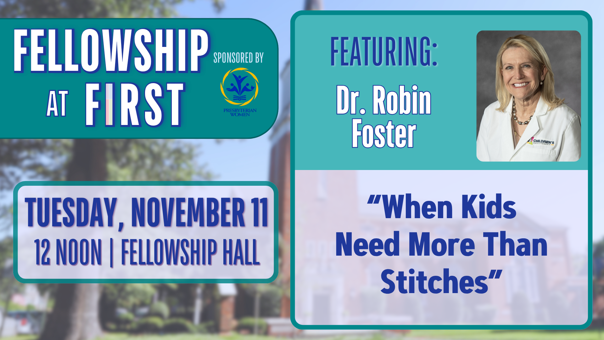 November’s Fellowship at First program will feature an FPC member, Dr. Robin Foster, who will discuss her work as a founder and leader of the VCU Child Protection Team. Jay Bryson will also provide a brief update on FPC’s Capital Campaign. Lunch is provided. Registration required.