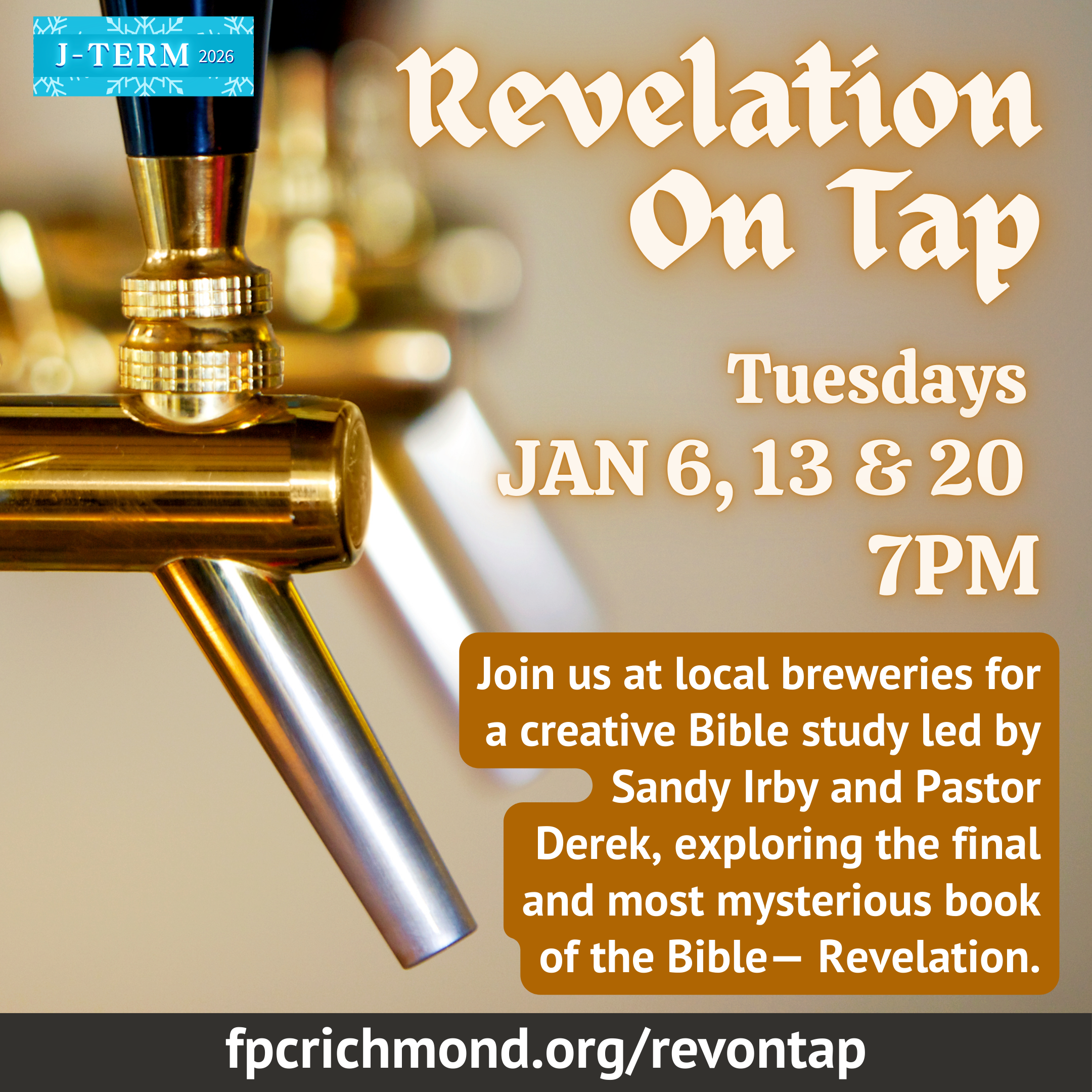 Join us for a creative J-Term Bible study exploring the final and most mysterious book of the Bible. We’ll meet at a local brewery for conversation, community, and fresh insight as Sandy Irby and Pastor Derek lead us through Revelation’s visions of hope and renewal. Fellowship begins at 7PM.; study from 7:30 to 8:30PM.