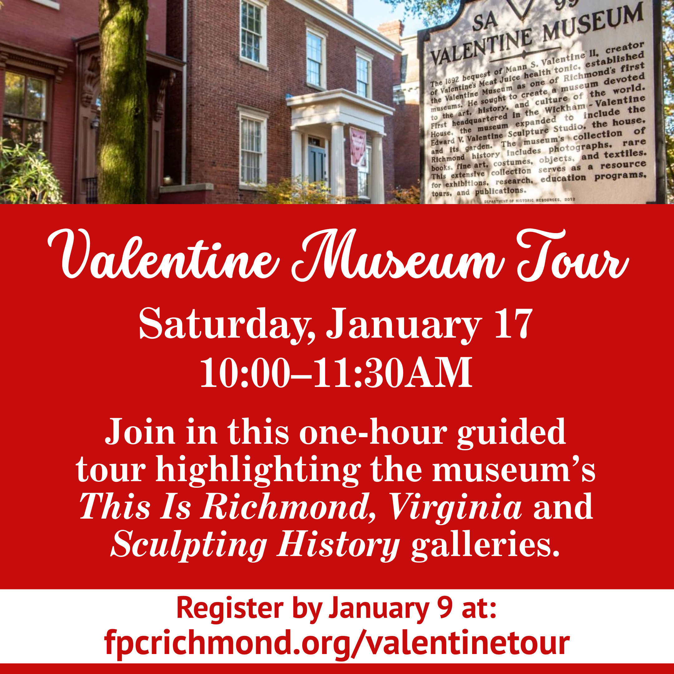 Join us for a special J-Term outing to the Valentine Museum. This one-hour guided tour highlights the This Is Richmond, Virginia and Sculpting History galleries. For 125 years, the Valentine has been collecting, preserving, and interpreting Richmond Stories, making it the only museum devoted entirely to the history and culture of our region.