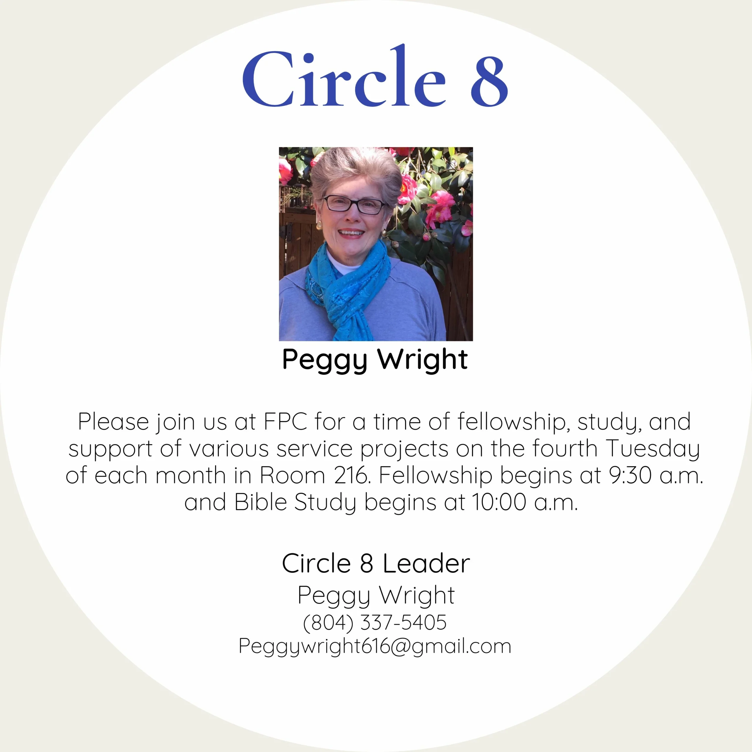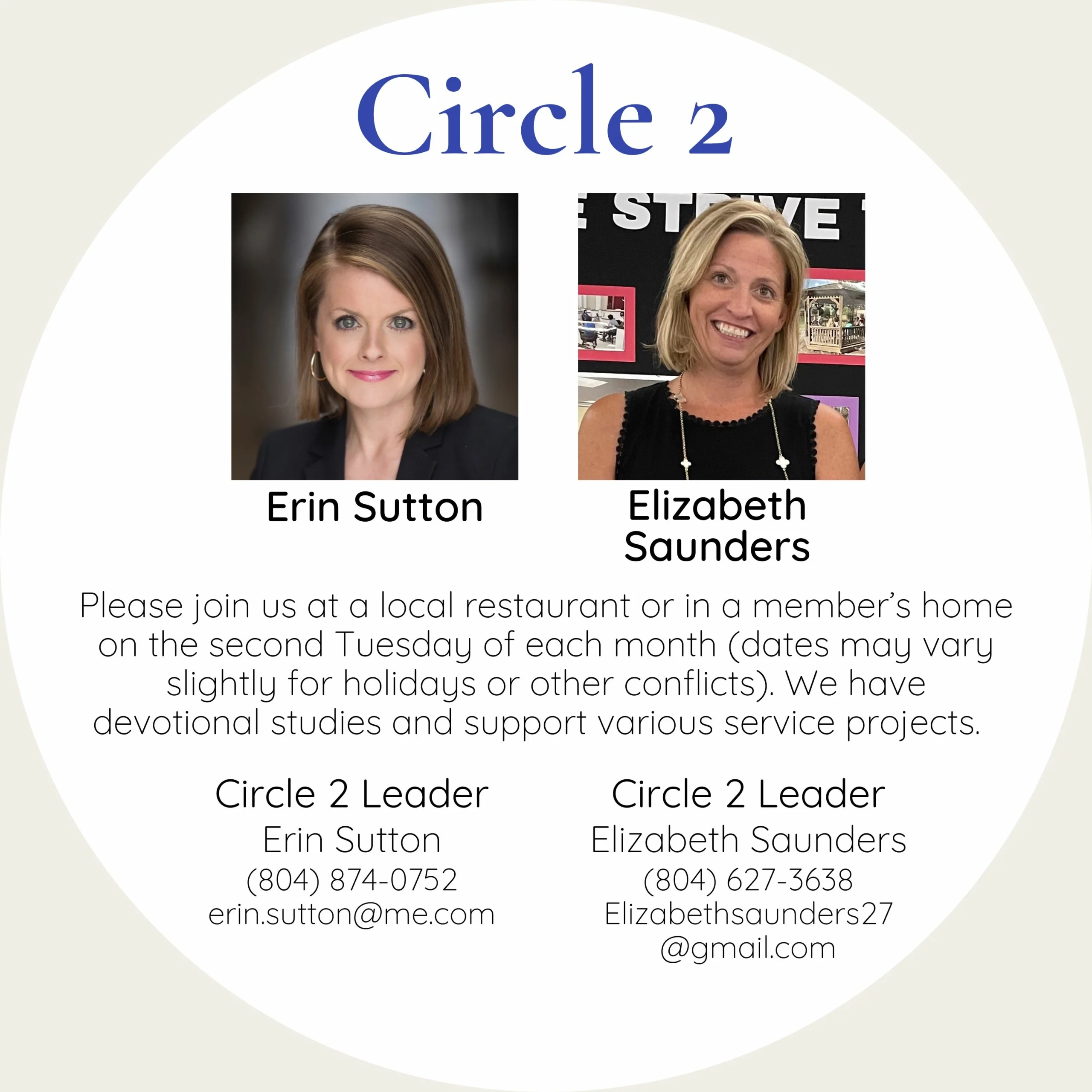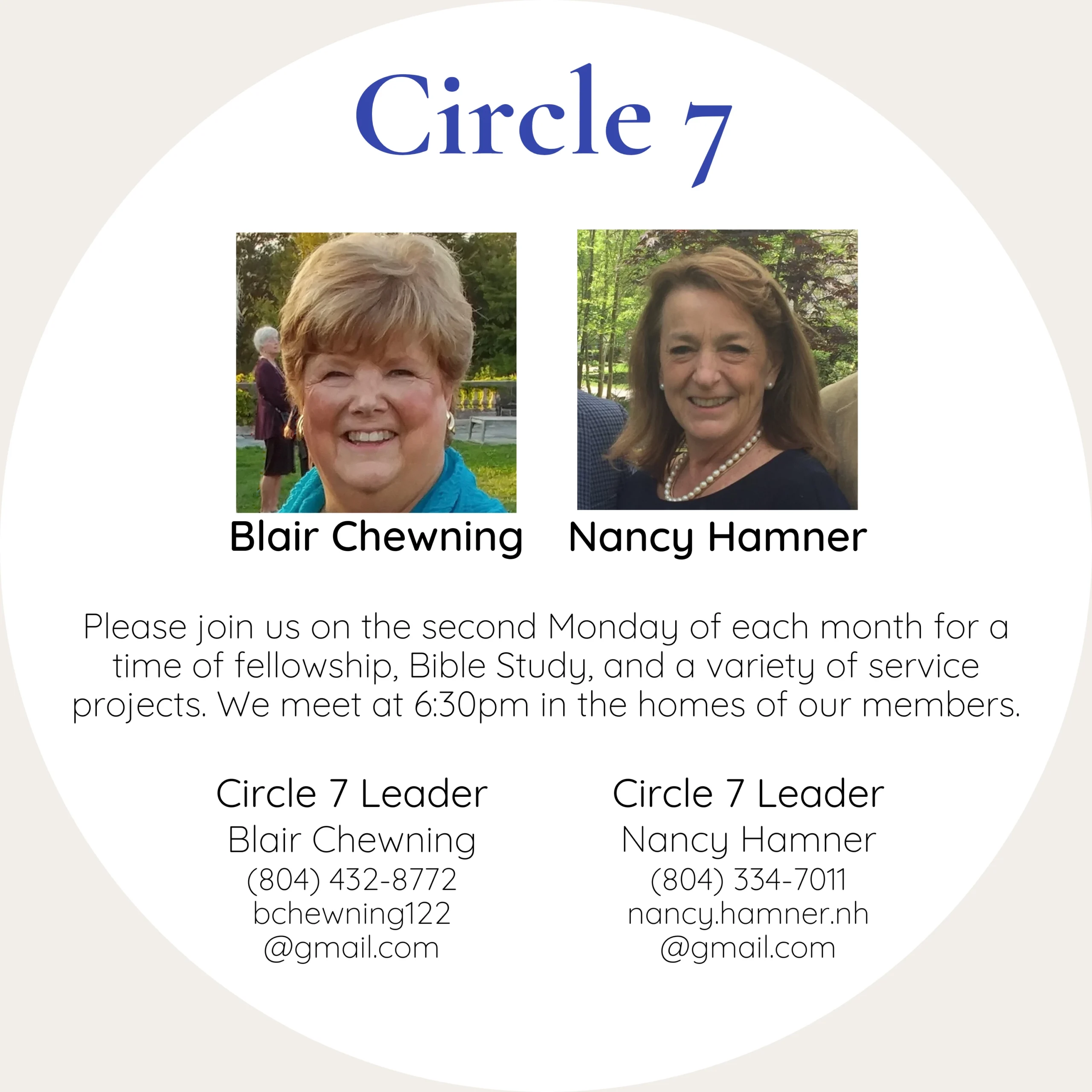 Check the church calendar monthly or contact any Circle Leader to find out about upcoming events and meetings. Additionally, please feel free to contact Neely Barnhardt, Moderator, or Blair Chewning, Membership Chair, to learn more about Circle membership.