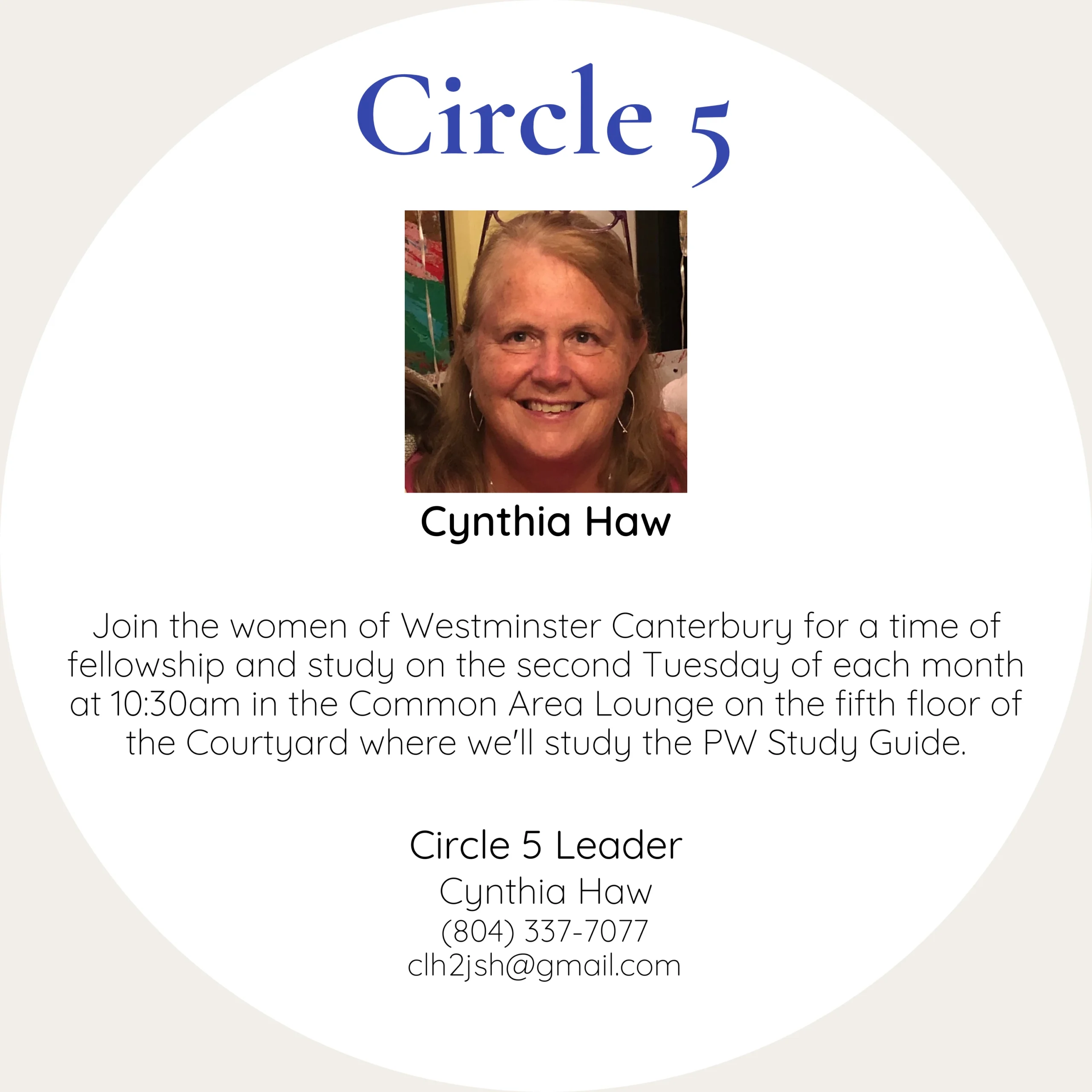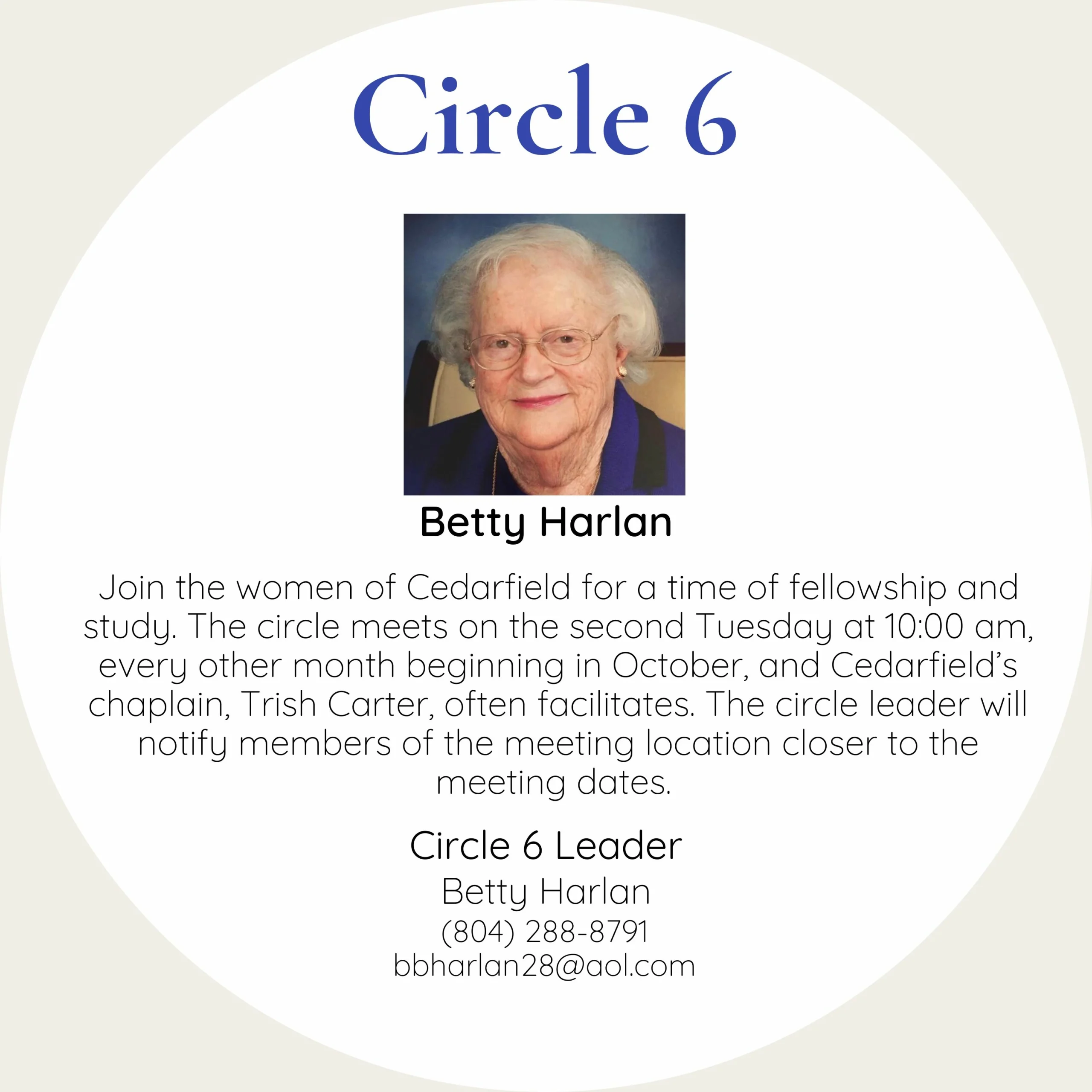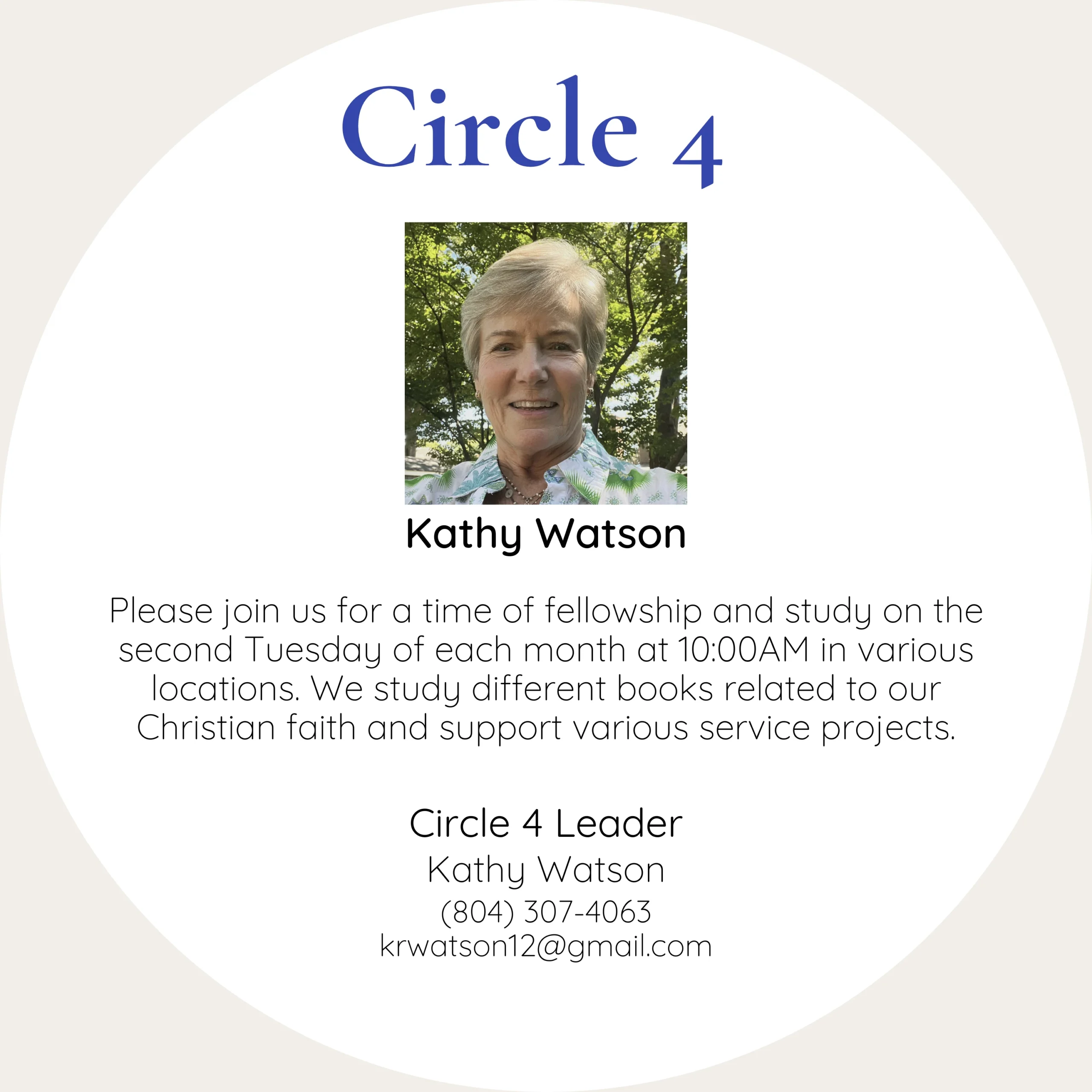 Check the church calendar monthly or contact any Circle Leader to find out about upcoming events and meetings. Additionally, please feel free to contact Neely Barnhardt, Moderator, or Blair Chewning, Membership Chair, to learn more about Circle membership.
